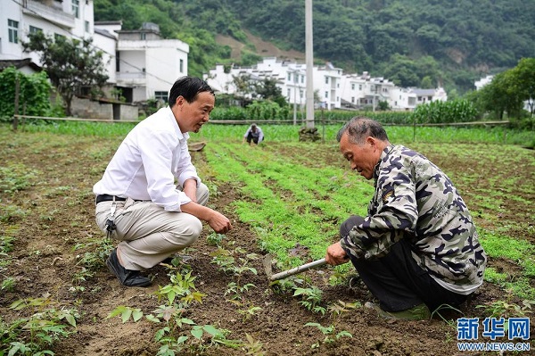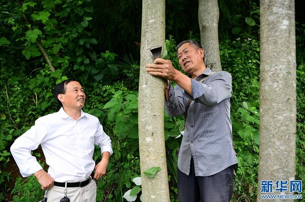 袁端姣(左)與父親袁輝志在龍頭村里查看漆樹苗(6月14日攝)(新華社記者 邵瑞 攝)