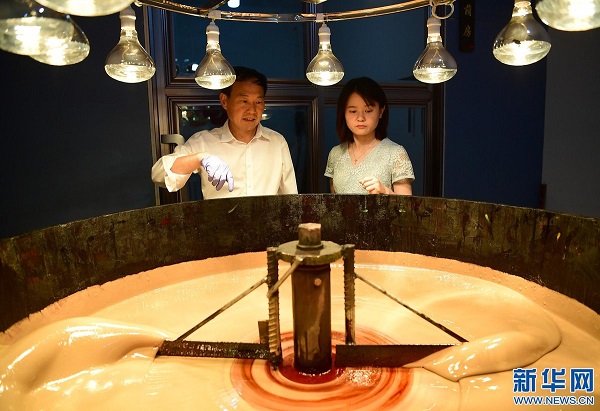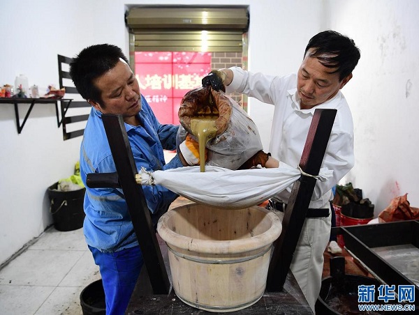 6月15日,袁輝志(右)與漆工肖業(yè)軍在車間內(nèi)將生漆倒進(jìn)濾布進(jìn)行初次過濾。(新華社記者 邵瑞 攝)