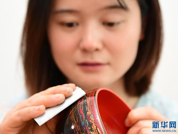 袁端姣在房間內(nèi)對(duì)一件完成上漆的漆器進(jìn)行打磨(6月14日攝)(新華社記者 邵瑞 攝)