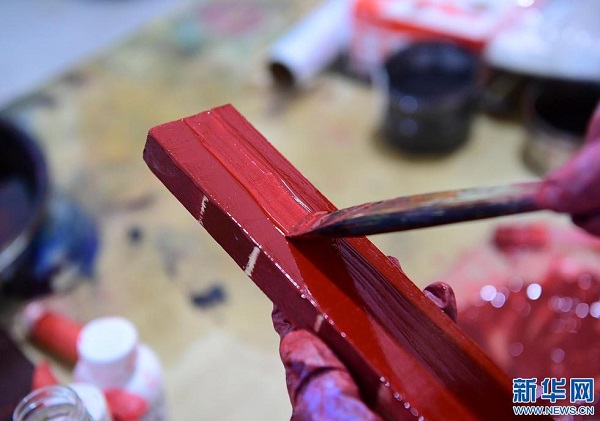 6月15日,袁端姣在車間內(nèi)用調(diào)制好的色漆進(jìn)行打樣。(新華社記者 邵瑞 攝)
