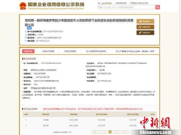 一家名為“寶雞有一群懷揣著夢(mèng)想的少年相信在牛大叔的帶領(lǐng)下會(huì)創(chuàng)造生命的奇跡網(wǎng)絡(luò)科技有限公司”近日走紅網(wǎng)絡(luò),該公司全名長(zhǎng)達(dá)39個(gè)字,被網(wǎng)友調(diào)侃為“史上最長(zhǎng)名字公司”。