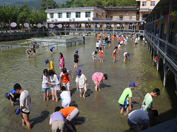 池塘捉魚,釋放兒童天性,同學(xué)們換好涼鞋拖鞋,就沖進魚塘去捉泥鰍抓金魚,先是把手進水里去摸,繞著身體掃大半圈也沒摸著。然后幾個人站成一排,把魚往池塘一角趕,受驚嚇的魚不時撞到學(xué)生的腳,嚇得膽小的同學(xué)趕緊跳到一旁,膽大的趕緊跑過去撈,還是沒撈著。最后大家站成一個圈往中間圍,總算撈了幾個泥鰍。