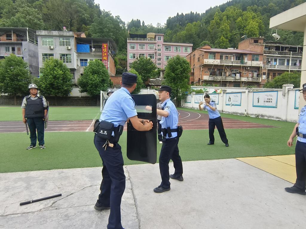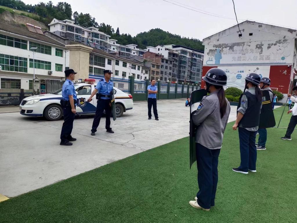 演練中,一名手持“利刃”的“歹徒”(扮演者)強(qiáng)行闖入校園,兩名保安手持防暴叉與盾牌和“歹徒”周旋。其中一名保安用鋼叉將“歹徒”控制在門(mén)崗處,另一名保安立即啟動(dòng)“一鍵報(bào)警”。同時(shí)向應(yīng)急總指揮報(bào)告情況,學(xué)校即刻啟用防暴反恐應(yīng)急預(yù)案,漩渦鎮(zhèn)派出所民警僅用3分鐘時(shí)間便趕到現(xiàn)場(chǎng)協(xié)助護(hù)校隊(duì)成功制服“歹徒”。