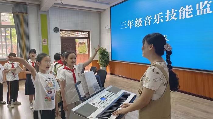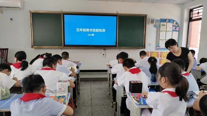 檢測現(xiàn)場,音樂學科通過學生自主選曲表演唱和口風琴、排簫、豎笛等小樂器演奏,引導孩子們感知音樂節(jié)奏、旋律、音色的美妙。美術學科的測評以繪畫為主,堅持教材與實際相結合,通過抽簽確定各班學生的創(chuàng)作主題,從造型表現(xiàn)和設計應用等方面進行評價??茖W學科由學生自主抽取實驗題目,通過動手操作、積極主動參與實驗過程,培養(yǎng)學生綜合實踐能力。體育學科的測評則根據(jù)不同年級學生的年齡特點,結合需要掌握的運動技能,設計了跳繩、折返跑、少年拳等項目,既是對孩子們身體素質(zhì)、運動技能的一次考查,也是對他們自信心、自覺性、意志力的一次考驗。