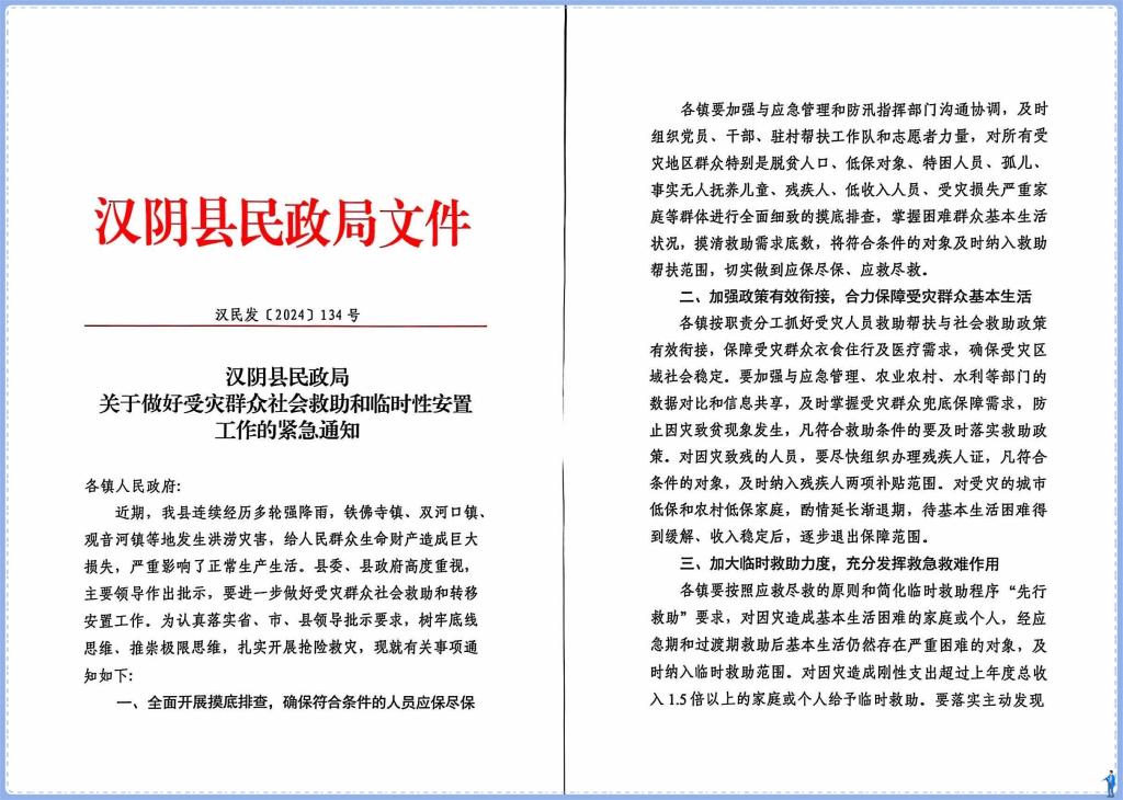 漢陰縣民政局表示,將積極促進低保、臨時救助等政策與受災(zāi)人員救助政策的有效銜接,及時將符合條件的受災(zāi)群眾納入救助保障范圍,保障困難群眾基本生活。同時,積極動員引導(dǎo)社會組織、愛心人士等力量,發(fā)揮自身資源優(yōu)勢,有序投身防汛救災(zāi)工作,共同助力做好困難群眾救助幫扶。