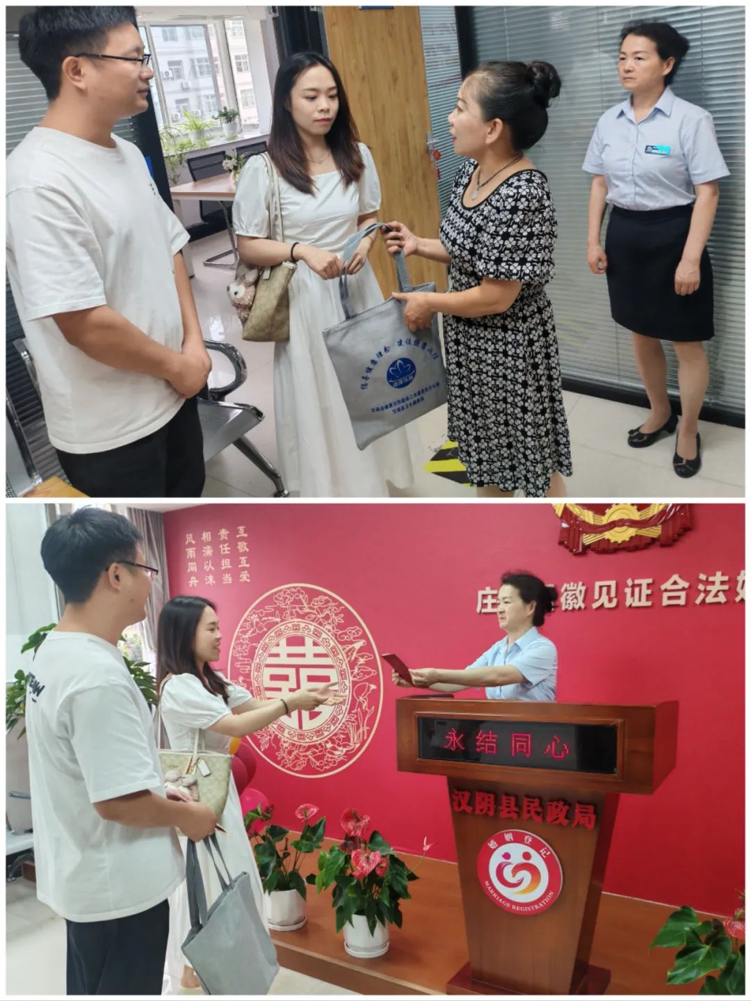 漢陰縣民政局婚姻登記中心主任專門安排工作人員為情侶進行婚前輔導后登記辦理結婚證,并派專車將一對對新人集體送往花遇灣(漢陰縣婚姻登記戶外頒證基地)頒發(fā)結婚證書,共同鑒證這個美好的幸福時刻。