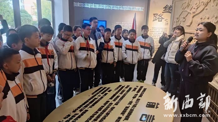 來(lái)到鎏金銅蠶出土地,學(xué)生們參觀了鎏金銅蠶系列浮雕群,了解鎏金銅蠶出土過程,并以“蠶桑文化”為主題,通過歌舞表演、故事宣講、繪畫展示等形式展示對(duì)絲綢之路文化的理解,以及金蠶的勤勞、奉獻(xiàn)、堅(jiān)韌等精神品質(zhì)。