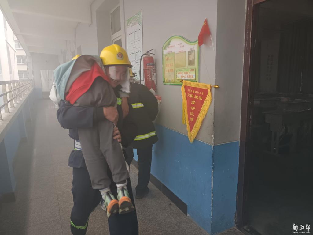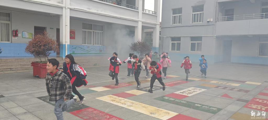 新西部網(wǎng)消息(通訊員姚華玖)11月7日下午2:35分,漢陰縣平梁鎮(zhèn)中心小學(xué)寧靜的校園里,師生們正如往常一樣安靜的上課。突然,一陣刺耳的警報(bào)聲劃破了校園的寧靜,只見該校兩棟教學(xué)樓里冒出“滾滾濃煙”,同學(xué)們急急忙忙從教學(xué)樓上迅速撤離到空曠地帶,各班在清理人數(shù)時(shí),發(fā)現(xiàn)六年級二班少了一名同學(xué)。搜救人員迅速攜帶裝備,沖進(jìn)教學(xué)樓,這時(shí)候,教學(xué)樓上的煙霧更大了,空氣中彌漫著刺鼻又嗆人的煙味。經(jīng)過仔細(xì)搜索,搜救人員在教室一張桌子下邊發(fā)現(xiàn)了“暈倒”在地的一位同學(xué),迅速把他轉(zhuǎn)移到學(xué)校醫(yī)務(wù)室“急救”。原來這是漢陰縣平梁鎮(zhèn)中心小學(xué)進(jìn)行的一場應(yīng)急消防疏散演練活動。