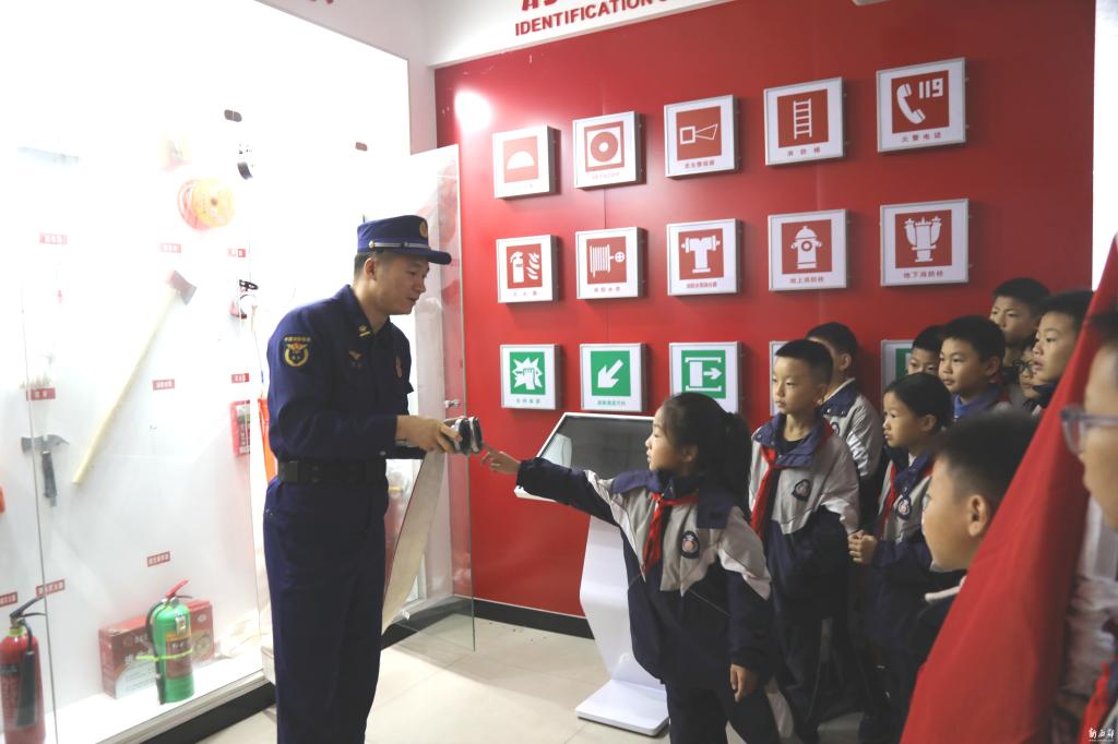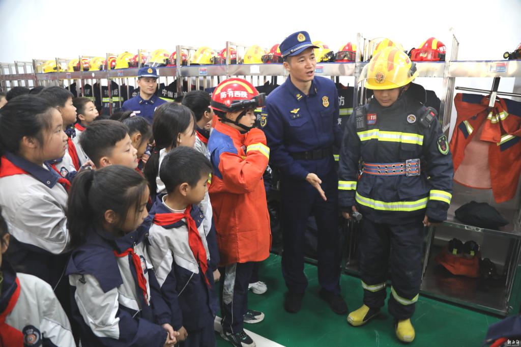 “孩子們,你們知道這兩套服裝有什么區(qū)別嗎?”“……這就是消防員防護服上的秘密”“當(dāng)處理道路搶險時,我們就會用到這套工具……”“你們掌握消防栓的種類和使用方法了嗎?”消防官兵一邊講解消防知識,一邊與參觀學(xué)生現(xiàn)場互動著。