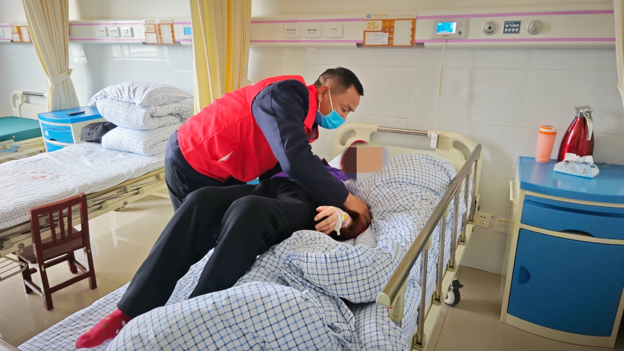 熊奶奶是目前收治患者中年齡最大的一位常年冠心病患者,家里兒女常年都在外地工作。入院時,熊奶奶因為拉肚子脫水致頭暈、乏力,生活自理已經(jīng)受到影響。基于患者這種情況,醫(yī)生護士特意交代護理員小張,平時不定時就到熊奶奶身邊陪護,幫助打開水、買飯、取檢查結果,用推車推著熊奶奶去做檢查、取檢查結果……“紅馬甲”忙碌的身影時刻穿梭在熊奶奶身邊,看在熊奶奶眼里,卻感動著病區(qū)的每個患者和家屬?!凹胰诉h在千里之外,生病時小張卻像親人一樣陪伴在自己身邊,雖然說住院這件事本身不美好,但在這里我覺得也不至于那么糟糕……”,熊奶奶眼里泛著淚光感動的說。