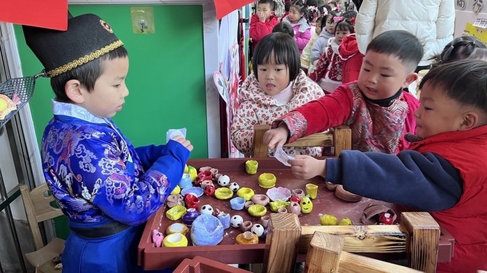 活動當天,精心策劃的“年貨一條街”人聲鼎沸,熱鬧非凡。大班的小朋友們化身攤主,忙前忙后,搭建起一個個童趣盎然、創(chuàng)意十足的小攤位。這些攤位上,既有形態(tài)各異的手工陶泥作品、色彩斑斕的編織飾品、滿載節(jié)日祝福的春聯(lián),也有晶瑩剔透的糖葫蘆、香氣四溢的小糕點等傳統(tǒng)美食,構成了一幅生動的新年畫卷。在老師們的帶領下,小朋友們手持“錢幣”,興高采烈地穿梭于各個攤位之間,挑選并兌換自己心儀的”年貨”,盡情享受著濃濃的年味。