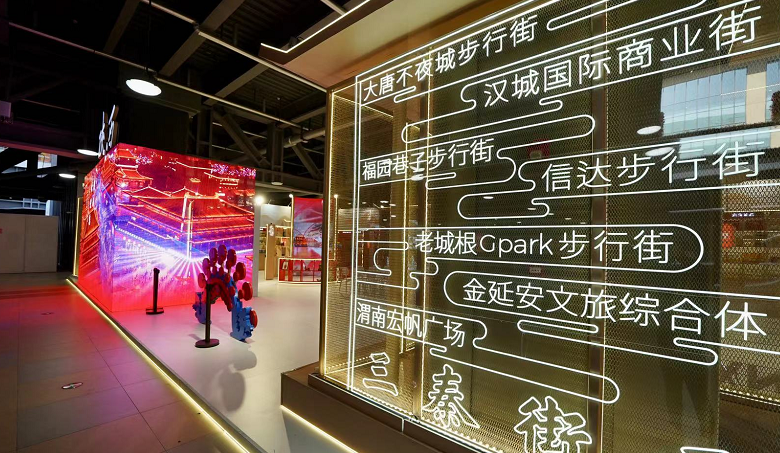 陜西人文交流活動(dòng)步行街和會(huì)客廳展區(qū)以“三秦腔調(diào)”為創(chuàng)意主題,衍生出“地標(biāo)建筑”“自然風(fēng)光”“老字號(hào)和非遺傳承”等篇章。展區(qū)外立面采用全景冰屏動(dòng)態(tài)視頻演繹,旨在展現(xiàn)陜西地域特色和厚重歷史文化。展區(qū)整體造型設(shè)計(jì)從秦腔傳統(tǒng)技藝“水袖”中汲取靈感,將舞袖靈動(dòng)與步行街區(qū)建筑的挑檐斗拱相結(jié)合,內(nèi)容上融入數(shù)字化展項(xiàng)技術(shù),于光影間彰顯陜西新形象。