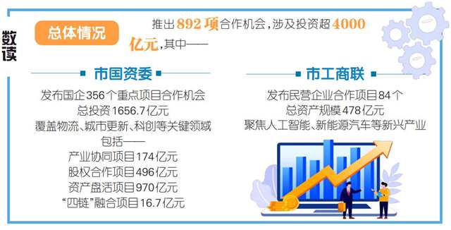 本次活動進(jìn)一步整合資源,形成多層次合作矩陣。其中,市國資委發(fā)布國企356個重點(diǎn)項(xiàng)目合作機(jī)會,總投資1656.7億元,包括產(chǎn)業(yè)協(xié)同(174億元)、股權(quán)合作(496億元)、資產(chǎn)盤活(970億元)及“四鏈”融合(16.7億元)四大類項(xiàng)目,覆蓋物流、城市更新、科創(chuàng)等關(guān)鍵領(lǐng)域;市工商聯(lián)發(fā)布民營企業(yè)合作項(xiàng)目84個,聚焦人工智能、新能源汽車等新興產(chǎn)業(yè),總資產(chǎn)規(guī)模478億元。