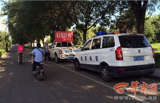 董先生是渭南市司法系統(tǒng)的退休干部,經(jīng)常與公、檢、法、司的幾個要好的退休干部到朝陽公園鍛煉。董先生告訴華商報記者,近期城管執(zhí)法局集中整治露天燒烤和占道經(jīng)營,??匆娨恍┏枪軋?zhí)法車輛在朝陽公園附近巡查宣傳,驅(qū)趕占道小販,這些城管執(zhí)法車輛都裝著警燈,執(zhí)法巡查時還閃個不停。