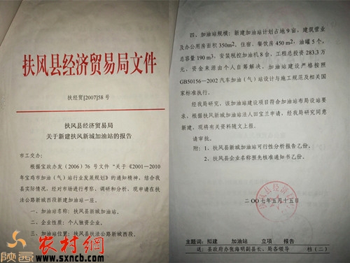 8月17日,記者來到了扶風縣,見到了舉報人曹林生。他告訴記者:“2006年10月27日,寶雞市工業(yè)交通辦公室(現(xiàn)寶雞市商務局)制訂了《2011---2010年寶雞市加油(氣)站行業(yè)發(fā)展規(guī)劃修訂方案》,209省道扶風縣新城區(qū)段規(guī)劃新增一座加油站。碰上這一機遇,我申請成為新城加油站項目投資人,并制作了《抽檢扶風縣新城加油站可行性分析報告》。2007年4月25日,我在扶風縣工商局做了“扶風縣新城加油站”企業(yè)名稱預先核準,《企業(yè)名稱預先核準通知書》載明保留至2014年9月3日。2007年5月15日,我向扶風縣工業(yè)商務信息化局(原扶風縣經貿局)提交了項目申請。同日,工業(yè)商務信息化局向寶雞市商務局(原寶雞市工業(yè)交通辦公室)提交了報告。2011年9月3日,為保險起見,我又在扶風縣工商局做了“扶風縣新城區(qū)加油站”企業(yè)名稱預先核準,《企業(yè)名稱預先核準通知書》載明保留至2014年9月10日。由于我一直未能爭取到土地手續(xù),寶雞市成品零售體系“十二五”規(guī)劃時,我申請保留了“扶風縣新城加油站”。按照國家《成品油市場管理相關規(guī)定》,申報建加油站需要發(fā)改、工商、土地、城建、商務局等部門逐步取得相關手續(xù)方可。2013年1月6日,我再次向扶風縣工業(yè)商務和信息化局提交了申辦“扶風縣新城加油站”申請,得到了相關部門的許可,辦事人員交代我繼續(xù)完善土地手續(xù)。2013年11月29日,我與合伙人蘇國慶終于拿到了“新城加油站”的扶風縣加油站土地使用證。從土地規(guī)劃、收儲、掛牌出讓等一路跟蹤,歷時兩年半耗資兩百余萬,我感覺有幾分欣慰,自己多年的努力終于看到了希望。”