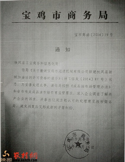 隨后,曹林生與扶風縣工業(yè)商務和信息化局、寶雞市商務局依然保持交涉。2014年7月24日,扶風縣工業(yè)商務和信息化局作出了讓步,向寶雞市商務局發(fā)出【2014】87號請示文件《關于撤銷寶雞市冠通機械有限公司新建新城加油站的許可資格的請示》,以“寶雞市冠通機械有限公司在接到新建通知后超過一年未能提供合格規(guī)范的相關資料”為由報請撤銷。曹林生以為此事應該有了新的進展。然而,2014年12月16日,寶雞市商務局向扶風縣工業(yè)商務和信息化局發(fā)出函件,函件要求扶風縣工業(yè)商務和信息局按照《成品油市場管理辦法》和省市有關要求,深入企業(yè)調查兩戶企業(yè)的訴求,拿出雙方都認可的處理意見,避免批復后又形成新的矛盾糾紛。這意味著寶雞市商務局從全局角度考慮并未同意扶風縣工業(yè)商務和信息化局【2014】87號請示文件。