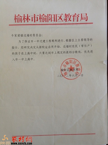 隨后,村民給記者出示了當(dāng)時(shí)榆陽區(qū)教育局的文件,文件下方顯示日期是2012年6月1日,在該文件上記者看到:“為了保證市一中遷建工程順利進(jìn)行,根據(jù)區(qū)上主要領(lǐng)導(dǎo)的指示,經(jīng)研究決定從新校址啟用開始,邊墻村農(nóng)民(常住戶)的孩子在上高中時(shí),只要達(dá)到市上規(guī)定的提檔分?jǐn)?shù)線,優(yōu)先進(jìn)入市一中上高中”。