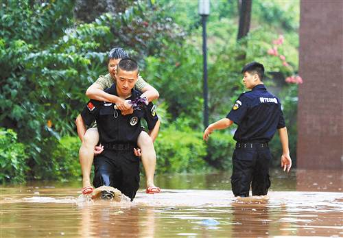 8月17日,大足區(qū)龍水鎮(zhèn)古南社區(qū),特警正在轉移群眾。8月16日20時到17日8時,大足區(qū)普降大到暴雨,降雨量最高達到211.6毫米,造成部分低洼地段的公路、房屋、魚塘等不同程度受災。通訊員黃舒 王廷志攝