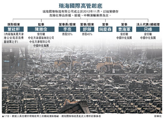 在此之前,內(nèi)地傳媒《財(cái)經(jīng)》最先披露,瑞海國際的真實(shí)股東之一為已故的天津港公安局原局長董培軍之子董社軒,其現(xiàn)已被調(diào)查。新京報(bào)也引述不具名的天津塘沽多名官員,證實(shí)董某是原天津港港口公安局局長之子,在瑞海公司持股并參與經(jīng)營。
