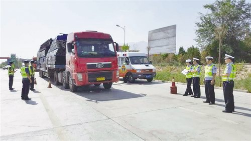 青海高速公路超載超限勸返站從今年4月投入使用。近期,因從外省收費站進入我省的超載超限車輛較多,自8月15日起,青海高速交警一大隊與樂都高速路政大隊聯(lián)合在馬場垣北側服務區(qū)開展不定時檢測超載超限違法車輛行動。圖為民警們正在檢查車輛。