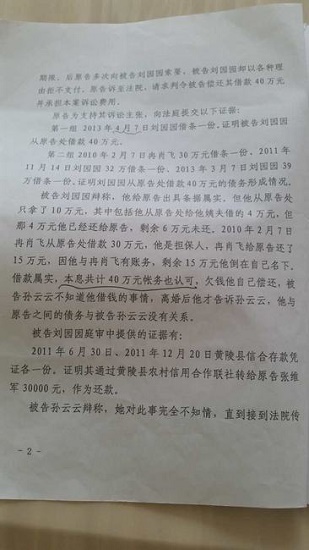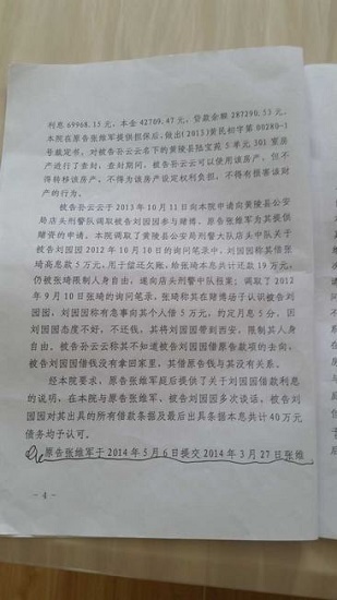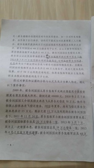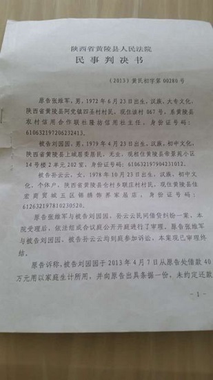 孫云云提供了一份黃陵縣人民法院的民事判決書(shū),從判決書(shū)上可以看出,黃陵縣隆坊信用社張維軍訴稱被告劉某某于2013年4月7日向其借款40萬(wàn)元,并“于2014年5月6日向法院提交了2014年3月27日張維軍49萬(wàn)元信用聯(lián)社收回貸款憑證,證明他按季支付利息?!?