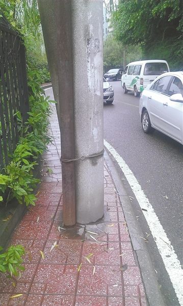 原本就很窄的人行道路上還有電線桿,行人只能側(cè)身而過。重慶晨報(bào)記者甘俠義攝