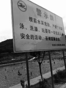 小峪水庫(kù)的人群也不亞于小峪河,水庫(kù)的水渾濁泛著黃色,但前來(lái)游泳的人顯然不顧及這些,來(lái)了就要下水。警示標(biāo)語(yǔ)“禁止下河游泳”就豎立在河邊,但對(duì)游客根本沒(méi)有起到任何警示作用。