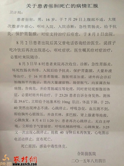 8月6日,記者來(lái)到合陽(yáng)縣醫(yī)院見到了該院姚副院長(zhǎng),得知記者來(lái)意,姚副院長(zhǎng)大概講了一遍事情經(jīng)過(guò),并拿出一份《關(guān)于患者死亡的病情匯報(bào)》給記者。