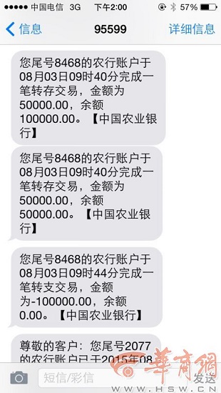 華商記者注意到,王先生的手機(jī)短信記錄顯示,第一次轉(zhuǎn)支交易發(fā)生在8月3日8時(shí)28分,轉(zhuǎn)支五萬(wàn)元,一分鐘后又轉(zhuǎn)支五萬(wàn)元。王先生說(shuō),情急之下,他趕忙向朋友求救,朋友說(shuō)盡快撥打銀行電話掛失?!拔亿s緊登錄網(wǎng)銀,故意輸錯(cuò)五次密碼,賬戶自動(dòng)鎖定?!彪S后,王先生以最快的速度趕到開(kāi)戶行中國(guó)農(nóng)業(yè)銀行榆林文化路支行,重新開(kāi)卡后,將剩余的100多萬(wàn)元都存入這張卡上。