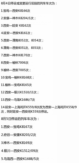 記者從西安鐵路局了解到,受西安及周邊持續(xù)降雨影響,8月4日、5日,西安鐵路局管內(nèi)經(jīng)隴海線運行的部分旅客列車停運或變更運行區(qū)段。