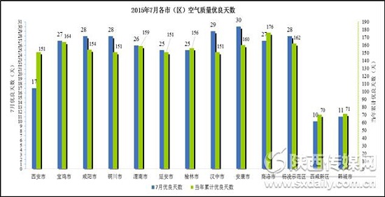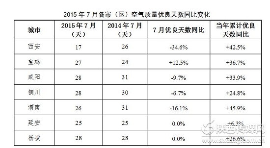2015年1~7月,全省11市2區(qū)空氣質(zhì)量優(yōu)良天數(shù)在70~176天之間。與2014年同期比較,關(guān)中各市(區(qū))1~7月優(yōu)良天數(shù)均有較大幅度增加。