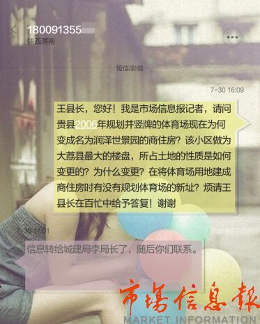 在記者等了4天也未等到任何回復(fù)后,記者撥打了大荔縣王縣長的電話,但王縣長電話處于無人接聽狀態(tài),隨后記者給王縣長發(fā)去了短信,希望得到相關(guān)回復(fù)。王縣長回短信稱“已將信息轉(zhuǎn)給城建局李局長,隨后聯(lián)系?!钡刂拱l(fā)稿,也未見到任何大荔縣官方的回復(fù)。(記者 樊向陽 李雅云)