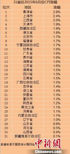 在31個(gè)省份中,青海6月份CPI漲幅最高,為2.8%,其次是上海(2.4%)和江西(2.0%),這三地也是全國僅有的CPI處于“2時(shí)代”的地區(qū)。新疆6月CPI漲幅僅為0.1%,為全國最低。