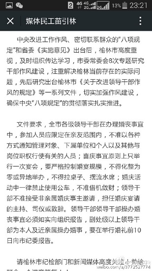 中央改進(jìn)工作作風(fēng)、密切聯(lián)系群眾的“八項(xiàng)規(guī)定”和省委《實(shí)施意見》出臺(tái)后,榆林市高度重視,及時(shí)組織傳達(dá)學(xué)習(xí),市委常委會(huì)8次專題研究干部作風(fēng)建設(shè),注重解決榆林當(dāng)前存在的實(shí)際問題,先后研究出臺(tái)榆林市《關(guān)于改進(jìn)領(lǐng)導(dǎo)干部作風(fēng)的規(guī)定》等一系列文件,切實(shí)加強(qiáng)作風(fēng)建設(shè),確保中央“八項(xiàng)規(guī)定”的貫徹落實(shí)扎實(shí)推進(jìn)。文件要求,全市各級(jí)領(lǐng)導(dǎo)干部在辦理婚喪事宜中,參加人員應(yīng)限定在親友范圍內(nèi),不準(zhǔn)以各種方式通知管理對(duì)象、下屬單位和個(gè)人以及其他與崗位職權(quán)行使有關(guān)的人員;喜慶事宜原則上只舉行一次宴會(huì),要嚴(yán)格控制婚宴規(guī)模,不得化整為零或異地舉辦,不得拉桌子、擺流水席;婚慶活動(dòng)中一律禁止使用公車,不準(zhǔn)借機(jī)斂財(cái);領(lǐng)導(dǎo)干部不準(zhǔn)接受非親屬婚慶事主邀請(qǐng),擔(dān)任婚慶宴請(qǐng)的主持、司儀或致辭。領(lǐng)導(dǎo)干部領(lǐng)導(dǎo)干部操辦婚喪事宜必須如實(shí)向組織報(bào)告,副處級(jí)以上領(lǐng)導(dǎo)干部為本人及近親屬操辦婚事,要在舉行婚禮前10日向市紀(jì)委報(bào)告。