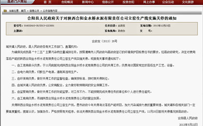 據(jù)合陽(yáng)縣政府合政發(fā)【2013】26號(hào)文件要求,由工信局牽頭負(fù)責(zé)完成陜西合陽(yáng)金水橋水泥有限責(zé)任公司的關(guān)停工作;由電力局負(fù)責(zé),切斷生產(chǎn)電源,遏制其違規(guī)生產(chǎn);由環(huán)保局負(fù)責(zé),做好關(guān)停工作的監(jiān)督檢查,確保按標(biāo)準(zhǔn)、按時(shí)限關(guān)停到位;由城關(guān)鎮(zhèn)人民政府負(fù)責(zé),公安局配合,全力做好取締期間的安全保障工作;由監(jiān)察局負(fù)責(zé),做好關(guān)停工作的效能監(jiān)察,對(duì)工作不力、不能按期完成關(guān)停任務(wù)的單位和個(gè)人進(jìn)行責(zé)任追究;由工商局負(fù)責(zé),吊銷陜西合陽(yáng)金水橋水泥有限責(zé)任公司的營(yíng)業(yè)執(zhí)照。