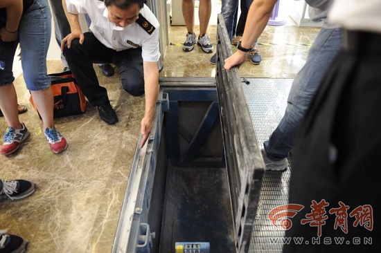 一名維保人員回答稱“應(yīng)該有”,但用工具將蓋板提起后,發(fā)現(xiàn)下面并無擰螺絲的地方,一時(shí)看起來有些尷尬。其他人員解釋說,這幾塊蓋板即便不上螺絲也是穩(wěn)固的,所留的孔只是為了方便提拉蓋板,所以不上螺絲也是可以的。