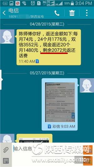 田先生找到了當初購買手機的電信網(wǎng)點,其負責人再一次向田先生表示抱歉,稱因之前工作人員變更,工作交接出現(xiàn)失誤,返款未做,并承諾給田先生做出賠償。賠償方法如下:雙倍返還24個月的74元贈費,共計3552元,其中現(xiàn)金返還2013年9月到2015年4月20個月的贈費,即1480元,剩余2072元在3個月之內(nèi)以話費的形式返還。