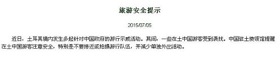7月5日,中國(guó)駐土耳其大使館發(fā)布旅游安全提示:“近日,土耳其境內(nèi)發(fā)生多起針對(duì)中國(guó)政府的游行示威活動(dòng)。其間,一些在土中國(guó)游客受到襲擾。中國(guó)駐土使領(lǐng)館提醒在土中國(guó)游客注意安全,特別是不要接近或拍攝游行隊(duì)伍,并減少單獨(dú)外出活動(dòng)?!?