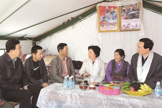 看望中,孫春蘭指出,“4·25”地震發(fā)生后,黨中央、國務(wù)院高度重視,習(xí)近平總書記和李克強總理、俞正聲主席等中央領(lǐng)導(dǎo)同志多次作出重要指示批示,為抗震救災(zāi)工作指明了方向、提供了遵循。自治區(qū)黨委、政府認(rèn)真貫徹落實習(xí)近平總書記和李克強總理、俞正聲主席等中央領(lǐng)導(dǎo)同志的重要指示批示精神,迅速啟動地震應(yīng)急預(yù)案二級響應(yīng),深入救援前線,現(xiàn)場調(diào)度指揮,組織多個部門,第一時間全面開展人員搜救和轉(zhuǎn)移安置,全力做好道路搶通、衛(wèi)生防疫等各項工作,保護了各族群眾生命財產(chǎn)安全,震后沒有因次生災(zāi)害造成1名人員傷亡,沒有發(fā)生一起意外事故。目前,災(zāi)后重建工作已經(jīng)展開。從這次抗震救災(zāi)中,西藏各族群眾再次切身感受到了以習(xí)近平同志為總書記的黨中央的親切關(guān)懷、祖國大家庭的溫暖和社會主義制度的優(yōu)越性。希望大家再接再厲、攻堅克難,深入扎實做好過渡安置、恢復(fù)重建等工作,讓災(zāi)區(qū)人民過上更加幸福美好的新生活。