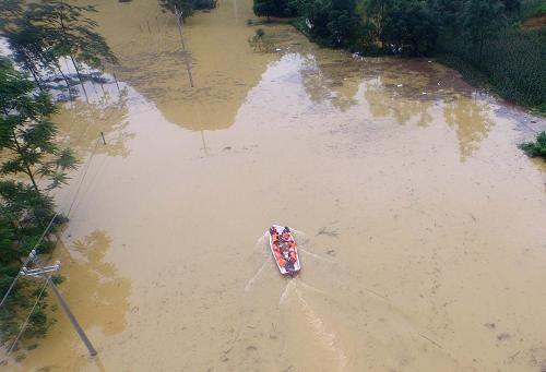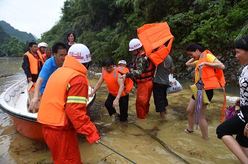 消防隊員在廣西大化瑤族自治縣六也鄉(xiāng)德禮村用沖鋒舟轉(zhuǎn)移群眾。新華社記者 黃孝邦 攝