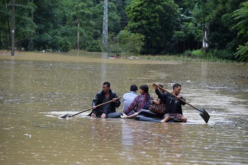 廣西大化瑤族自治縣六也鄉(xiāng)德禮村群眾在嚴(yán)重內(nèi)澇的農(nóng)田上轉(zhuǎn)移。新華社記者 黃孝邦 攝