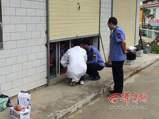 6月15日下午3時(shí)許,華商報(bào)記者在張勝虎家附近看到,小吃店門口已經(jīng)被警戒,店內(nèi)有民警和食藥監(jiān)人員在忙碌。