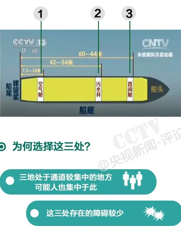 據(jù)央視記者消息:現(xiàn)場(chǎng)指揮部成員連夜制定進(jìn)一步的救援方案,目前考慮到的是兩個(gè)方案,第一個(gè)方案,是要把這船體切割,然后再讓潛水員下去。目前設(shè)計(jì)的切割點(diǎn)有三個(gè):空氣艙、污水井、首空艙。因?yàn)檫@三個(gè)位置是通道比較集中的地方,也就意味著可能是當(dāng)時(shí)逃生人員比較集中的地方。