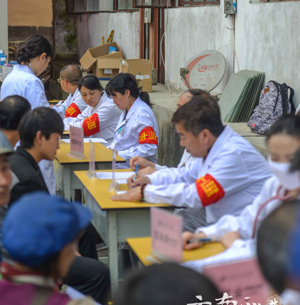 6月3日早上九點(diǎn),醫(yī)療隊(duì)的二十多位專家來到了獨(dú)龍江巴坡村,在當(dāng)?shù)卮逦瘯?huì)的門前搭起了簡易醫(yī)院。幾張桌子,幾條板凳構(gòu)成了這個(gè)臨時(shí)的“云南省第一人民醫(yī)院”。還沒等所有的設(shè)備準(zhǔn)備好,就有村民前來體檢就診。隨著時(shí)間的推移,越來越多的村民聚集到了這塊半個(gè)籃球場大的小廣場上,有的還是專門騎摩托車從別的地方趕來的。