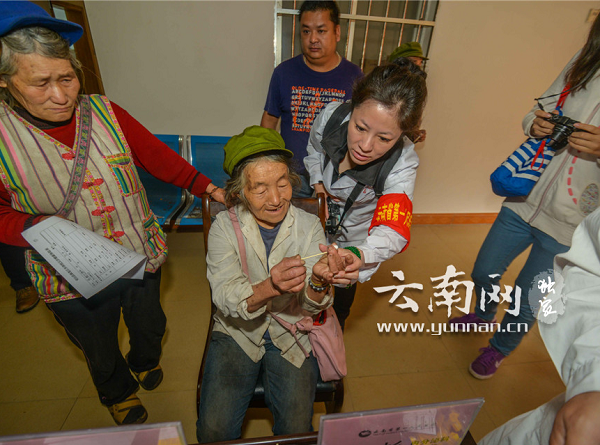 這邊是村民們越來越多,那邊是醫(yī)生們忙得不可開交,僅一上午就已經(jīng)發(fā)放出100多張?bào)w檢表,盡管忙碌,但這群白衣天使們依然耐心細(xì)致的給每一位村民體檢。量血壓、測血糖,“有多高?多大了?按這里疼不疼……”有村民聽不太懂醫(yī)生們的詢問,他們就一遍又一遍的重復(fù),直到村民完全明白醫(yī)生的意思。