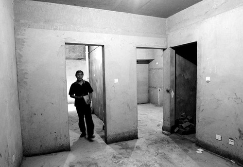 記者了解到,這里是紅廟坡村的拆遷安置房,董大爺之前是住在糖坊街的,兩年前他們那里的19戶人被安置到這里。當(dāng)初定房子的時(shí)候,他們只知道多大面積,而對(duì)于戶型、朝向、樓層及房子結(jié)構(gòu)等,均一概不知。老兩口等了兩年,終于在今年的5月10日拿到了新房鑰匙,沒想到打開門,董大爺他們看到的卻是這般情況?!拔覀兝蟽煽诰偷戎@房子住呢,沒想到這房子竟然沒有窗戶,而且就是裝修的話,廚房的油煙機(jī)往哪裝?空調(diào)往哪裝?”董大爺說,這房子根本就沒法住人?!捌鋵?shí)我要求也不高,就是有采光、通風(fēng)就行?!本瓦B裝修工人也說,在房子里待時(shí)間長了,感覺十分憋悶。董大爺告訴記者,這棟樓總共30層,每一層的04室都是這樣的格局,他說:“這個(gè)戶型目前就我一家打算住,其他人家我也不清楚他們是怎么打算的。”