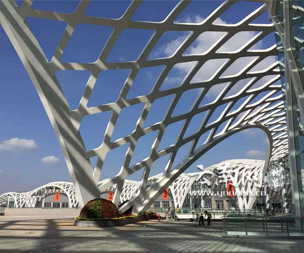昆明滇池國際會展中心項目鋼網(wǎng)格呈半圓形分布,以孔雀開屏為原型設(shè)計,結(jié)合昆明的地理位置和氣候特點,設(shè)置鋼網(wǎng)格灰空間(“灰空間”,也稱“泛空間”,意指建筑與其外部環(huán)境之間的過渡空間,以達到室內(nèi)外融和的目的),營造出強烈、絢麗的光影效果。外弧網(wǎng)格每個單拱僅有四個受力支點,各拱兩兩相連,如孔雀開屏,美不勝收;內(nèi)弧網(wǎng)格分東西兩側(cè),單側(cè)跨度約240米,中間設(shè)若干結(jié)構(gòu)縫,緊緊包攏,如孔雀雙腋,羞羞不敢示人;主序廳跨度近350米,為整個網(wǎng)格結(jié)構(gòu)最難部位,大氣磅礴,如孔雀昂首鳴啼。
