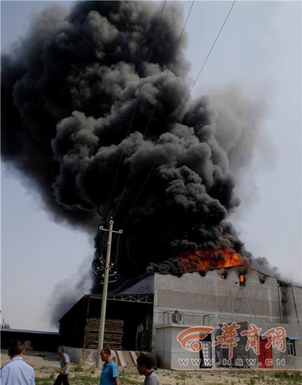 2015年5月27日,渭南市澄城縣安里鎮(zhèn)段莊村。 冷庫(kù)火勢(shì)很大,濃煙滾滾