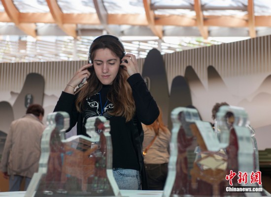 一名游客通過耳機(jī)認(rèn)真的聆聽館內(nèi)的講解