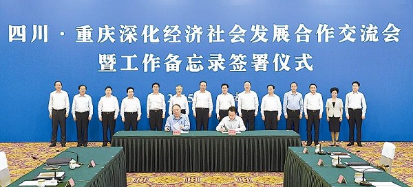 在21日上午舉行的四川·重慶深化經(jīng)濟(jì)社會(huì)發(fā)展合作交流會(huì)暨工作備忘錄簽署儀式上,孫政才、王東明分別講話,黃奇帆、魏宏介紹了兩省市經(jīng)濟(jì)社會(huì)發(fā)展情況并代表重慶市人民政府、四川省人民政府,簽署關(guān)于加強(qiáng)兩省市合作共筑成渝城市群工作備忘錄。備忘錄確定,兩省市將共同推動(dòng)交通、信息、市場(chǎng)一體化,共同加強(qiáng)公共服務(wù)互助、資源環(huán)境保護(hù)與利用聯(lián)動(dòng)、產(chǎn)業(yè)發(fā)展合作,并建立雙邊合作工作機(jī)制,加強(qiáng)規(guī)劃引導(dǎo)和政策互動(dòng)。力爭(zhēng)到2020年,將成渝經(jīng)濟(jì)區(qū)打造成為國(guó)家重要的統(tǒng)籌城鄉(xiāng)發(fā)展先行示范區(qū),將成渝城市群建設(shè)成為國(guó)際知名、國(guó)內(nèi)領(lǐng)先、輻射帶動(dòng)西部地區(qū)發(fā)展的重要增長(zhǎng)極。